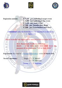 ATTENZIONE! Per questioni organizzative NON SARANNO PIU’ ACCETTATI pagamenti sul campo. Le quote versate NON SARANNO rimborsate in caso di mancata partecipazione del tiratore.